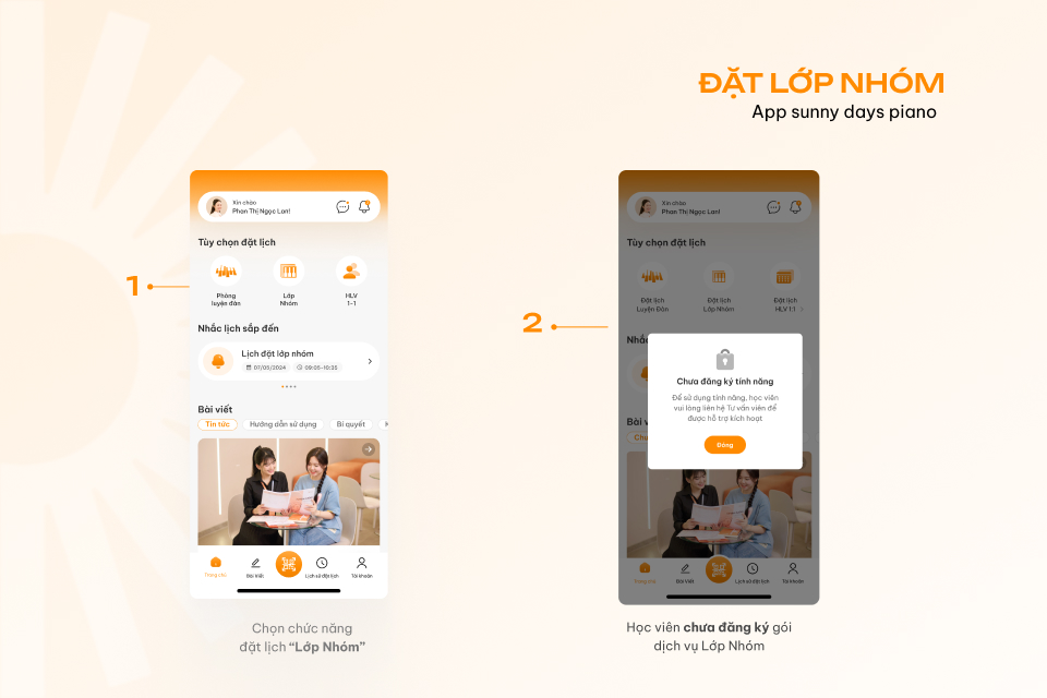 Với ứng dụng Sunny Days Piano, học viên có thể đặt lịch học Piano Lớp Nhóm sau khi đã ký hợp đồng tương ứng tại Sunny Days Piano. Nếu chưa đăng ký, khi nhấn vào chức năng đặt lịch "Lớp Nhóm", ứng dụng sẽ hiển thị thông báo như sau:
