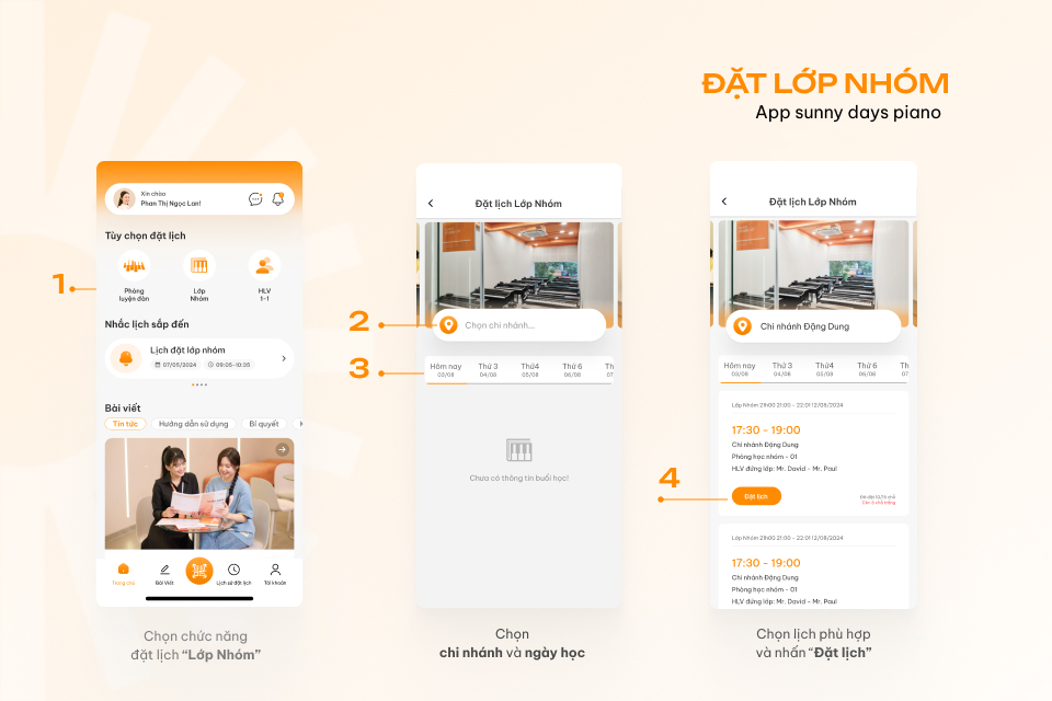 Khi đã ký kết hợp đồng, học viên được phép đặt lịch học piano Lớp Nhóm cho 7 ngày tiếp theo. Để đặt lịch học đàn, học viên cần thực hiện các thao tác sau: