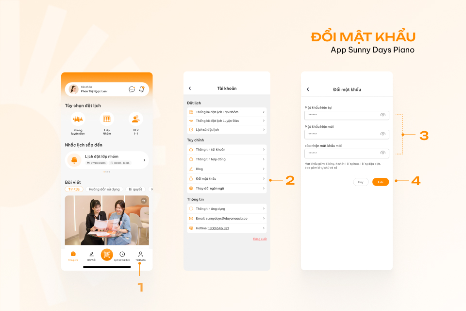 - Bước 3: Để tăng tính bảo mật, Sunny Days Piano yêu cầu học viên đổi mật khẩu mới để dễ dàng ghi nhớ và đảm bảo an toàn. Tiến hành nhập mật khẩu hiện tại, mật khẩu mới và xác nhận lại mật khẩu mới -> Nhấn nút “Lưu” để chuyển qua màn hình đăng nhập lại.