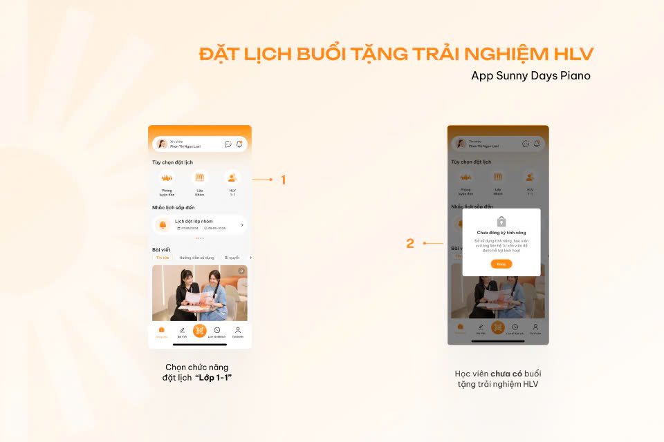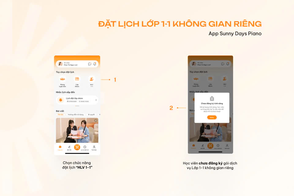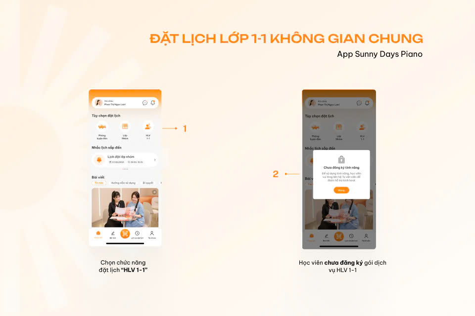 Học viên có thể đặt lịch học lớp 1-1 không gian riêng sau khi đã ký hợp đồng tương ứng tại Sunny Days Piano. Nếu chưa đăng ký, khi nhấn vào chức năng đặt lịch HLV lớp 1-1 không gian riêng, ứng dụng sẽ hiển thị thông báo như sau: